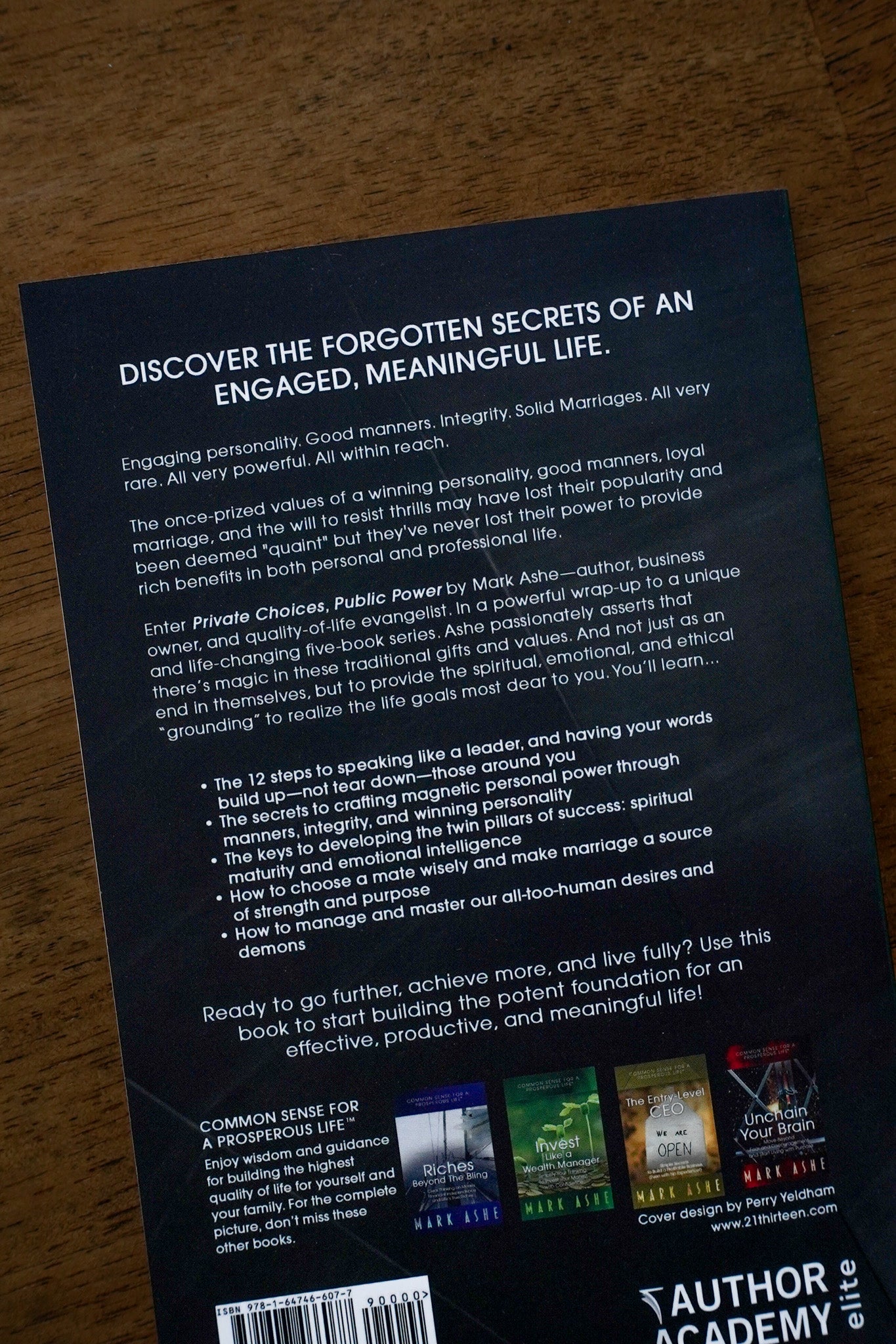 Enter Private Choices, Public Power by Mark Ashe—author, business and quality-of-life evangelist. In a powerful wrap-up to a unique and life-changing five-book series. Ashe passionately asserts that there’s magic in these traditional gifts and values. And not just as an end in themselves, but to provide the spiritual, emotional and ethical “grounding” to realize the life goals most dear to you.
